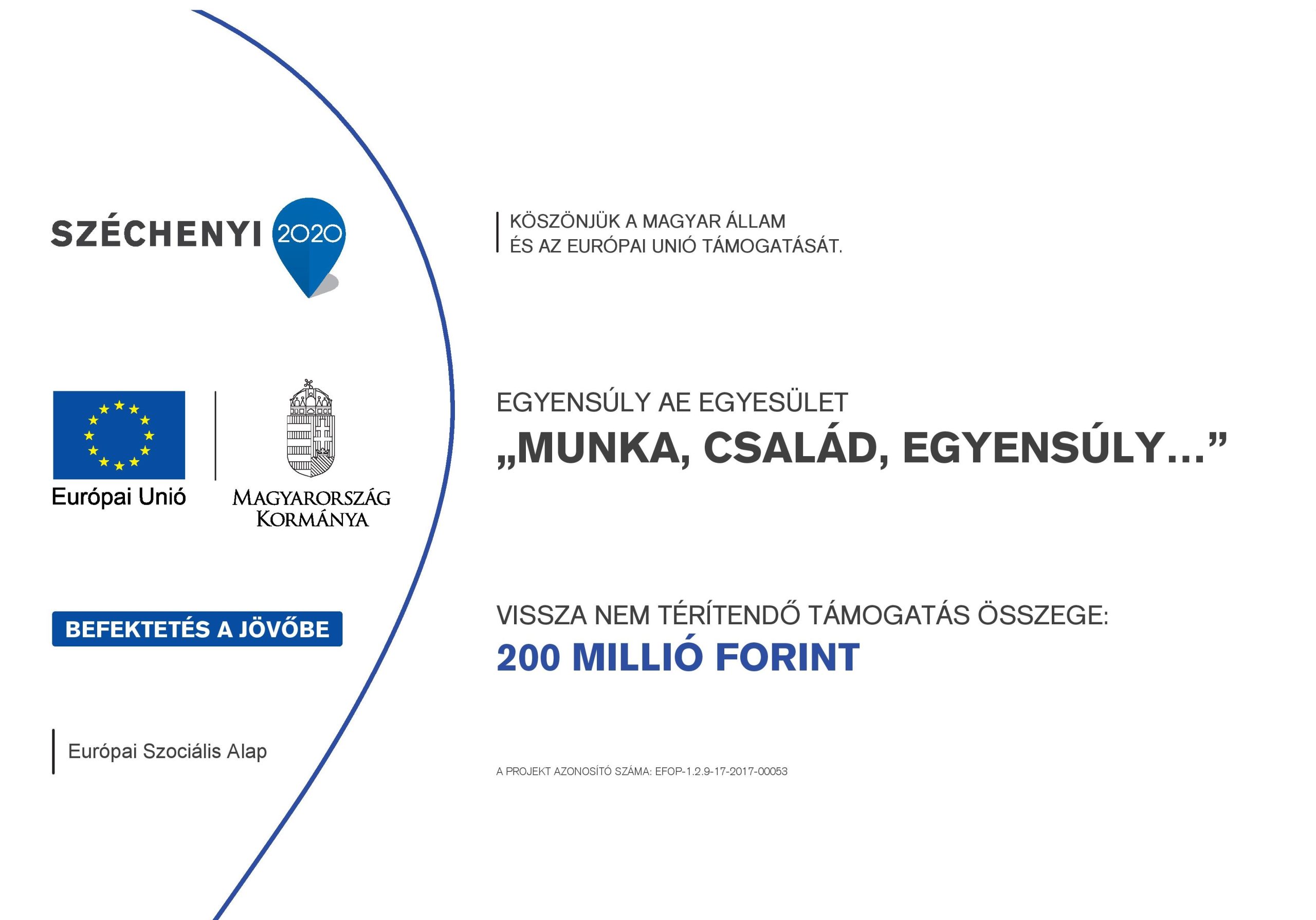 A „Munka, Család, Egyensúly…” projekt az Egyensúly AE Egyesület kezdeményezése egy olyan térségi munkaerő-piaci állapot kialakítására, amely a helyi megoldásokra és együttműködésekre alapozva megkönnyíti az atipikus munkavállalást és a munkaerő-piaci szempontból hátrányos helyzetű nők munkaerő-piacra való gyorsabb visszatérését. Csakis e célok elérése által javulhat a nők munkaerő-piaci helyzete mellett fenntartható módon a családok anyagi helyzete, illetve a kisgyermekes anyák társadalmi presztízse, mentálhigiénés állapota és önbecsülése is. Az Egyesület és partnerei saját jó gyakorlatai bemutatásával is példát kíván adni a térségben. Családbarát vállalat cím tulajdonosa 2015-óta. Az atipikus foglalkoztatás számos lehetőségét kihasználva.
