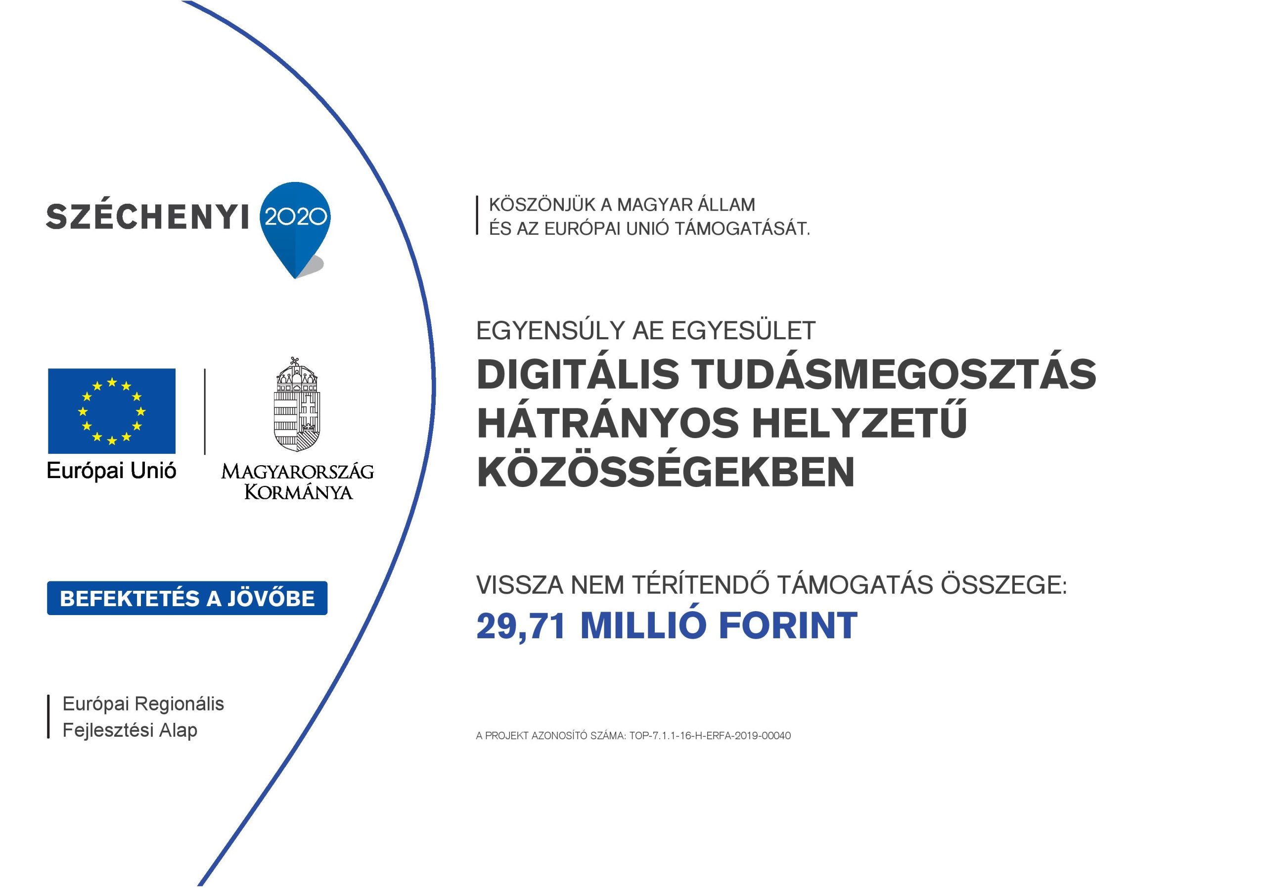 Továbbá a projekt megvalósítását követően szervezetünk vállalja, hogy 5 évig fenntartja a projektet, valamint 3 évig biztosítja a megvalósuló fejlesztések általánosítható tapasztalatainak hozzáférhetőségét. Továbbá a fenntartási időszakban szervezett, a projekthez kapcsolódó programokról tájékoztatja a projektbe bevont, ebbe írásban beleegyező célcsoport tagokat.
